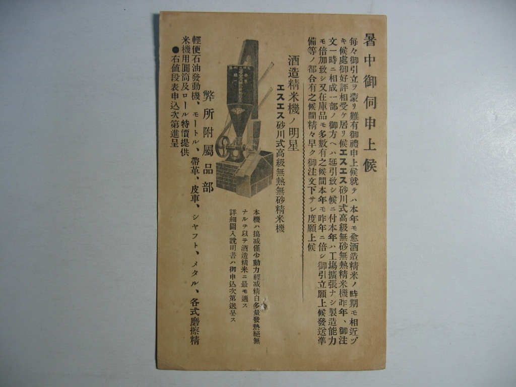 エスエス砂川式高級無熱無砂精米機広告砂川製作所絵葉書