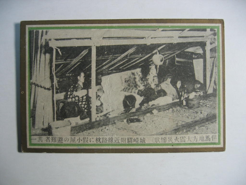 但馬地方大震火災惨状・城崎駅附近線路枕に假小屋の避難者絵葉書