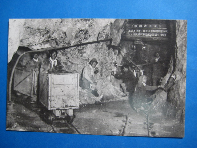 三菱佐渡鉱山構内?岩機堀並ニ手掘ノ実況ト鉱車絵葉書