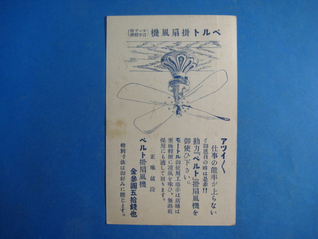 月野盛清商店ベルト掛扇風機広告絵葉書 イラスト入