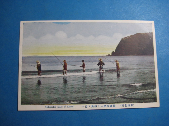 熱海名所横磯海岸ヨリ初島を望む絵葉書 海岸での魚釣り