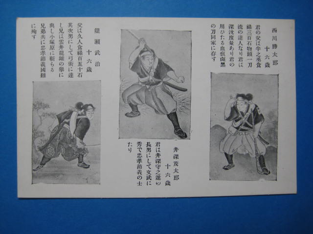 会津史蹟名所白虎隊西川勝太郎と井深茂太郎と簗瀬武治絵葉書