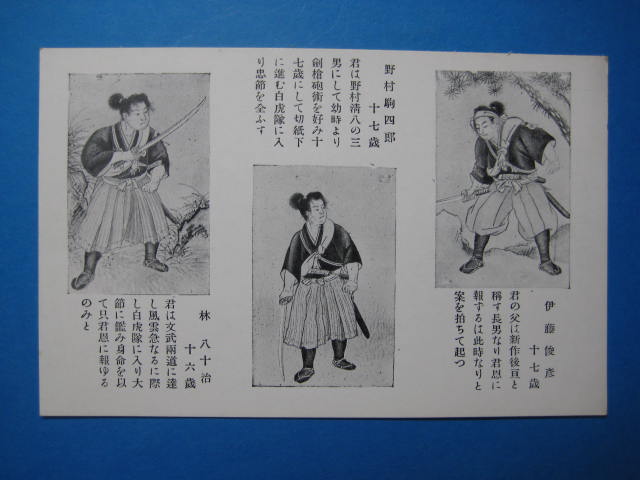 会津史蹟名所白虎隊伊藤俊彦と野村駒四郎と林八十治絵葉書