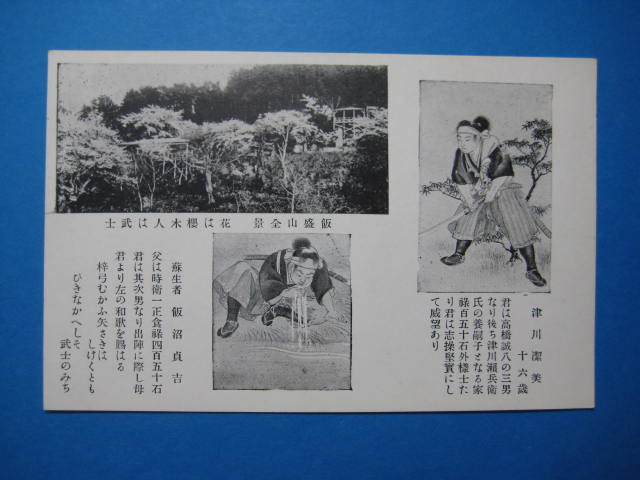 会津史蹟名所白虎隊津田潔美と飯沼貞吉と飯盛山全景絵葉書