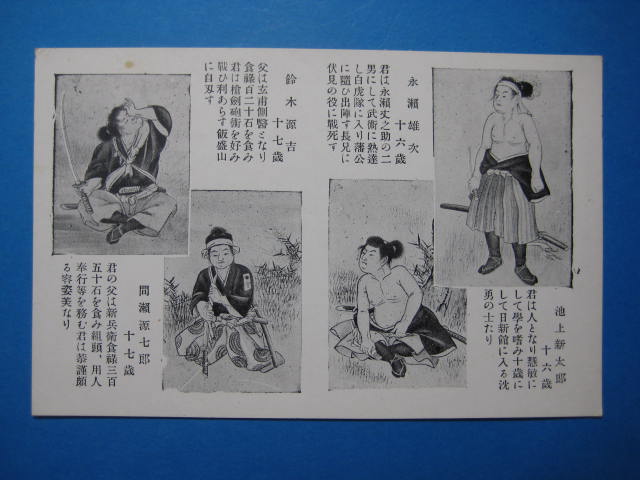 会津史蹟名所白虎隊池上新太郎と永瀬雄次と鈴木源吉と間瀬源七郎絵葉書
