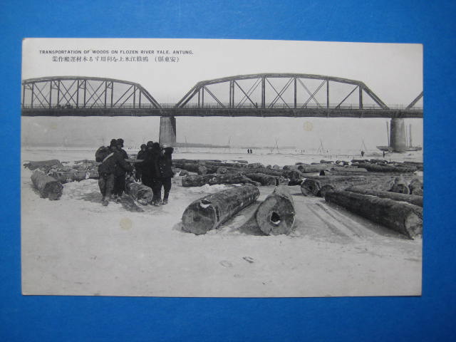 安東県鴨緑江氷上を利用する木材運搬作業絵葉書