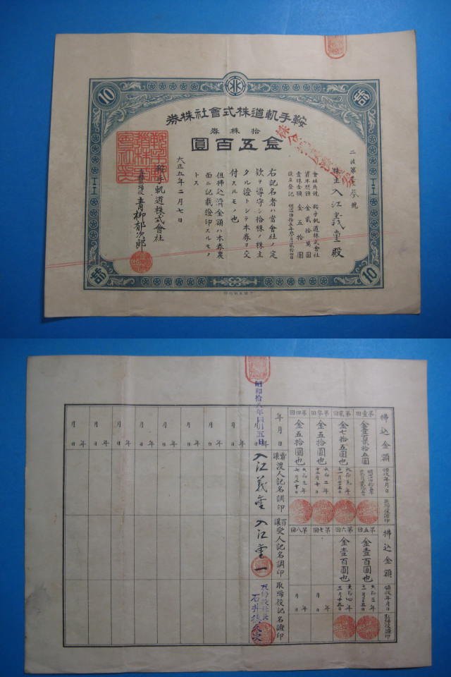 鞍手軌道株式会社株券 10株券金500円 大正5年 (福岡県直方ー鞍手)