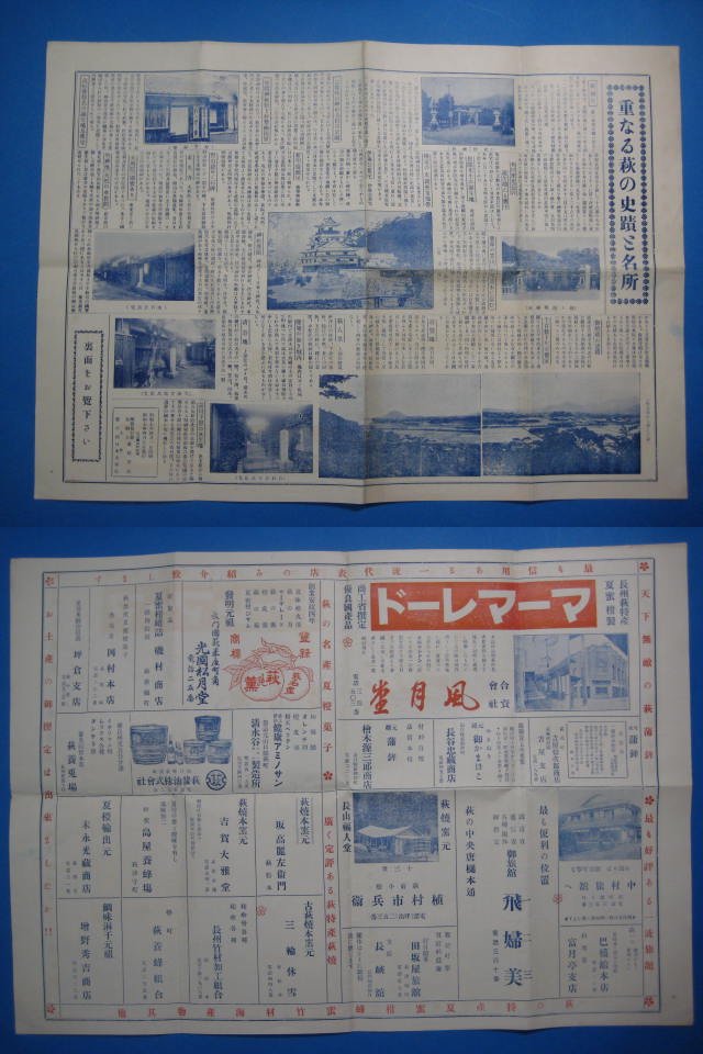 重なる萩の史蹟と名所 (旧萩城・松陰神社・椿方面から望んだ萩・他) 裏商店広告